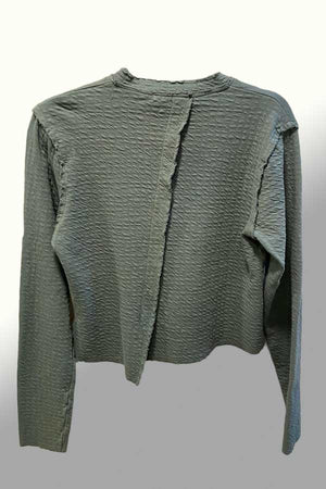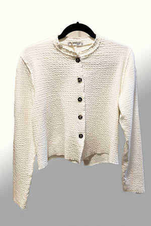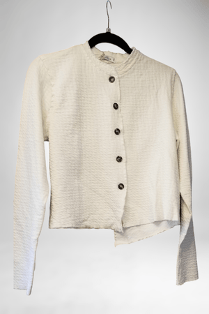 This is a long-sleeved, assymetrical short jacket with bit longer back. Lovely textured fabrication, buttons in front, unlined. No pockets. Super cozy, super soft, very good looking.