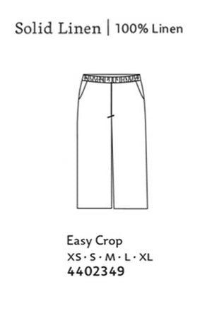 Nice linen cropped pants (in TWO fabric weights). Made in the U.S.A. is easy, comfortable, and well-cut with good sizing, two side pockets. Comfortable 2" wide covered rubber waist, breathable linen fabric of substantial weight where you don't feel too exposed.  Perfect for everyday life, comfortable, soft, and healthy. Well sized and comfortable.