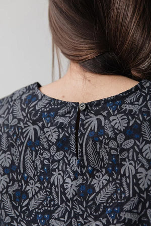 A very nice cotton dress with short sleeves. Generous wide sleeves and ample body fit makes this dress an easy, go-anywhere dress. Wonderful print with jungle plants and animals is toned down by black and grey coloring.