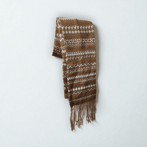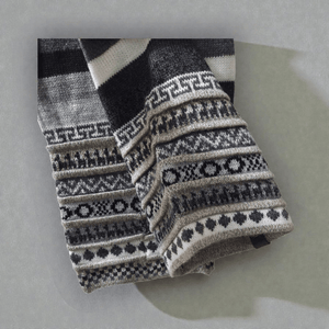 These nice, wide alpaca scarves are double-knit for warmth and feature traditional Peruvian patterns. This alpaca fine knit tubular double-sided alpaca scarf is in beautiful natural earth tones. Unique classic Faire-Isle style knit.