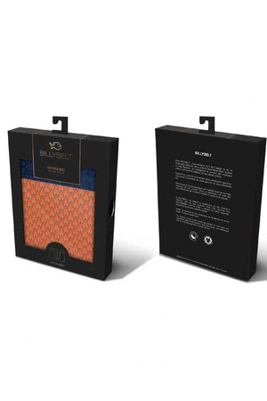 Men's organic cotton jersey boxer briefs from far away in France with yellow fish detail on a navy background. Great styling and fit, modern fabrication, impeccable attention to detail. Briefs are navy background color with a small yellow fish pattern printed on. These organic boxer briefs feature 1.5" comfortable waistband elastic in navy color, no functioning fly, fabric doubled at fly for comfort.