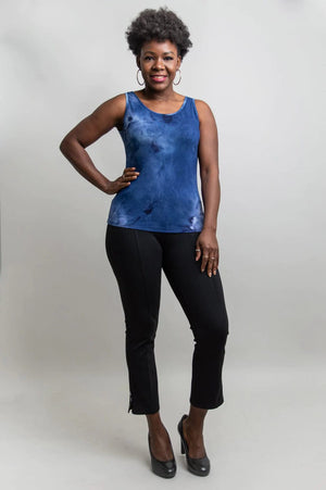 This comfortable tank top falls to the mid-hip, featuring a deep scoop neckline. Made of stretchy, cooling bamboo viscose fabric which provides great ventilation and stays cool in summer. It fits true to size. Fabulous tie-dye effect color of Saphire blue.