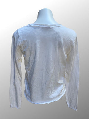This essential linen-cotton jersey cropped pocket cardigan features a button up V-neck, a small front pocket, long sleeves and ruffled hems. A simple addition to add easy elegance to any wardrobe!