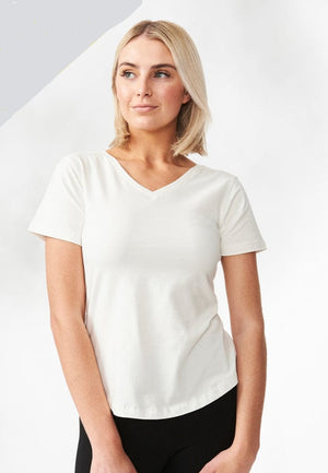 A perfect organic cotton T-shirt in classic basic colors. The flattering V-neck opening can be reversed to a scoop neck. The tee is a great length. Super soft, breathable and lightweight organic fabric - tee has a perfect contoured fit, combined with a flattering curved hem - a winner for essentials.