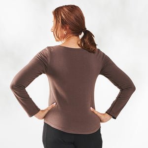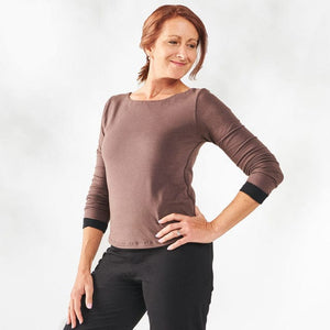 Two-tone reversible, contoured fit long sleeve shirt that hugs the body. Featuring an elegant boat neck and sleeve that hits just above the wrist, this feather-light shirt is as functional as it is comfortable. Perfect for cool days!