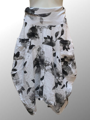 Our best selling "Magic" style skirt in beautiful new linen textile. The fun puffed bottom is asymmetrical with varied length and a 4.5" wide cotton ribbing at the waist - very flexible and comfortable, forgiving in sizing. No pinching, no bulging. This skirt looks great with all kinds of shoes, sophisticated and flowing.