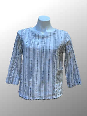 Lovely top featuring 3/4 sleeves, pocket, and raw edge on bottom.